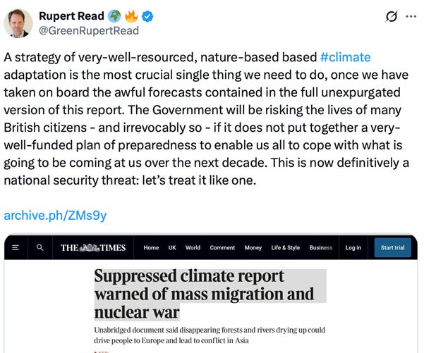 The claim is that the original report was blocked at the top of the British government for being too negative. This is obvious nonsense. No claim of eco-system collapse and devastating climate change would ever be considered too extreme by almost the entire British political class, at least if past evidence is anything to go on. It appears that the report was compiled by the Joint Intelligence Committee, which coordinates the work of MI5 and MI6. It only saw the light of day with publication by the Government’s environment department following a Freedom of Information request from the Times newspaper. Green author and activist Rupert Read was suitably affronted by what was seen as a cover up.