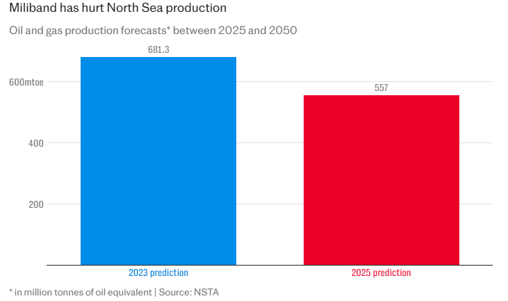 The downgrade in North Sea output emerges from comparing the production projections published by the NSTA in 2023 – before the election – with the latest versions, just published.