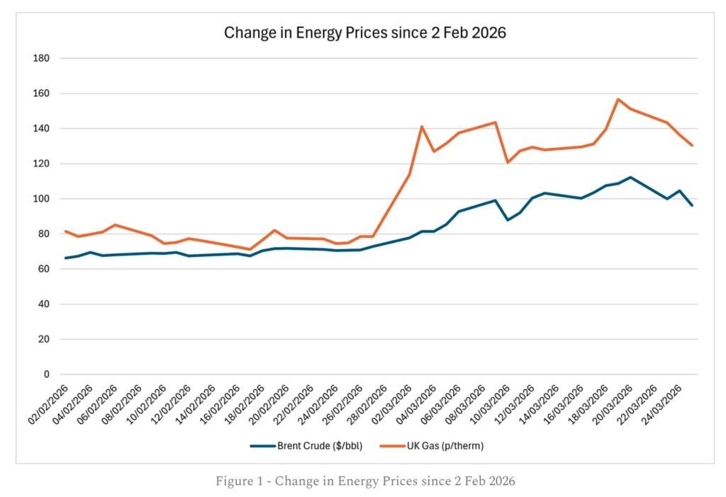 Using the start of February as a baseline, Brent crude prices are up 45% to $96 per barrel on 25 March and UK gas prices are up over 60% to 130p/therm although both prices have dropped a little from their highs.