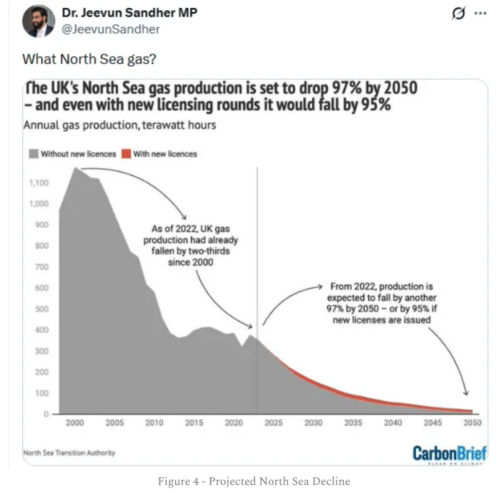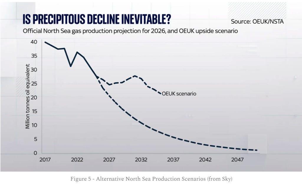 However, the gas production forecasts from the North Sea Transition Authority (NSTA) assume the current tax and regulatory regime that is discouraging investment remains in place. It is hardly surprising that production falls steeply when no new exploration drilling is allowed. Incidentally, part of NSTA’s mission is to “accelerate the move to net zero” so their pessimistic stance is unsurprising. Ed Conway from Sky has been effective in showing that if we move to a more benign environment production would fall much more slowly (see Figure 5).
