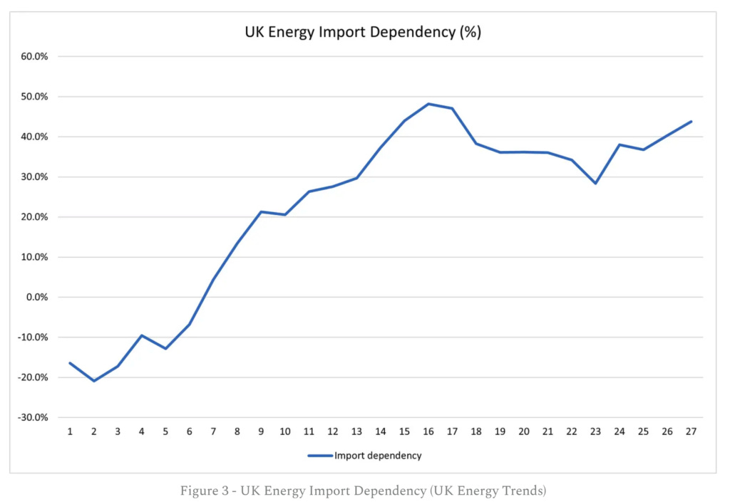 Despite the biggest ever oil supply shock and rising energy import dependency (see Figure 3, from Energy Trends Table 1.3), the Government has not made any commitments to increase domestic hydrocarbon supply.