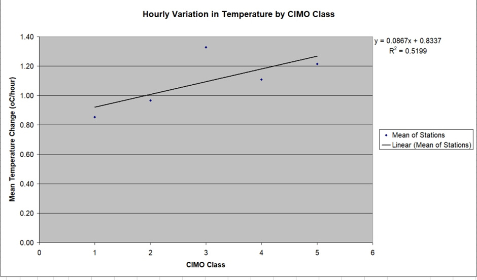In simple terms the graph demonstrates that the lower the CIMO class (with Class 5 being the lowest), and thus the greater the uncertainties in temperature measurement, the greater the average hourly temperature changes. The workings at the top right indicate the calculation for the linear rise across the CIMO classes. The only large outlier is caused by Heathrow at Class 3, whose average 1.48°C per hour change would place it as an extreme Class 5 station. “Who knew?” comments the author.