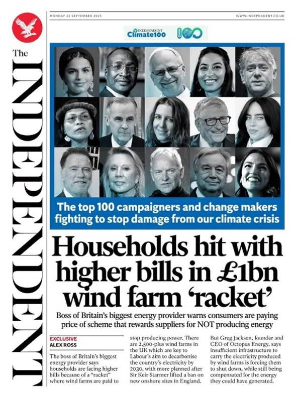 There are two related, emergent trends in green politics at the moment. The first is that, in the face of rapid geopolitical shifts, the global green agenda is weakening, perhaps terminally. Second, the UK’s green agenda is facing a reckoning also, as it becomes obvious that the costs are overwhelming the budgets of households and businesses, leaving the Government’s promises of 'lower bills' a distant and painful memory. These two trends meet in a somewhat clumsy attempt to counter them in Monday’s edition of the Independent newspaper-turned-website this week.